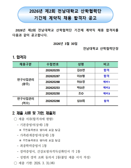 2026년 제2회 전남대학교 산학협력단 기간제 계약직 채용 합격자 공고